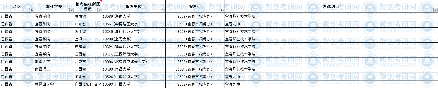 同学们可参考去年或者往年的考场安排,一般不会有改变,以下是聚创考研网 整理的去年报名【3608宜春市招考办】报考点的考场信息,同学们可根据本科院校、报考学校等作为参考。