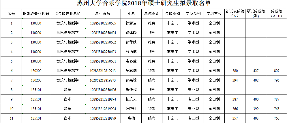 2018年苏州大学音乐学院硕士研究生拟录取名单