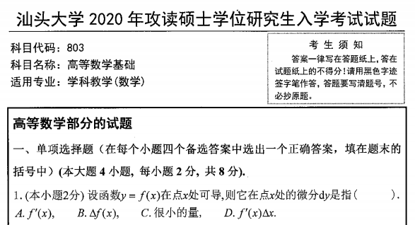 考研学习中,专业课占的分值较大。报考院校专业的考研专业课真题是专业课复习中必不可少的资料。聚创汕头大学考研小编为大家整理了2020年汕头大学803高等数学基础考研真题(完整版),并且可以提供汕头大学考研专业课辅导,希望更多考生能够考上理想的院校。