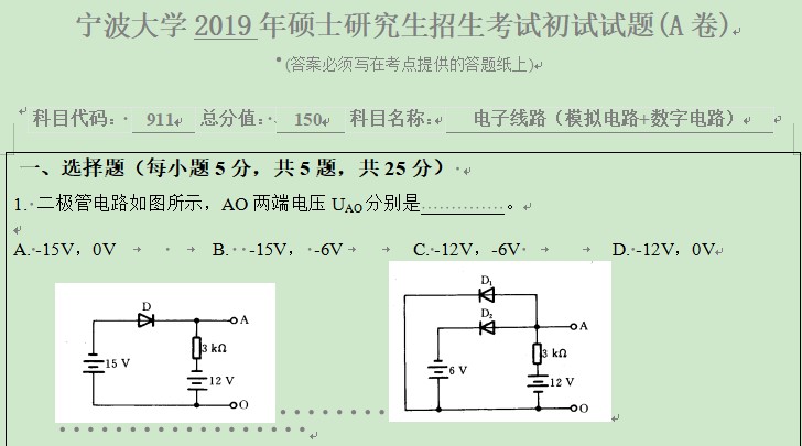 完整版请下载附件:2019年宁波大学911电子线路(模拟电路+数字电路)(A卷)考研真题(完整版)
