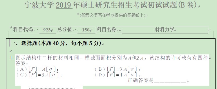 考研学习中,专业课占的分值较大。报考院校专业的考研专业课真题是专业课复习中必不可少的资料。聚创宁波大学考研小编为大家整理了2019年宁波大学923材料力学(B卷)考研真题(完整版),并且可以提供宁波大学考研专业课辅导,希望更多考生能够考上理想的院校。
