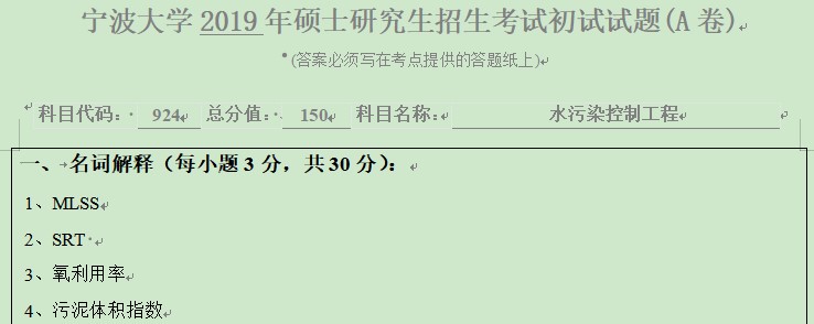 考研学习中,专业课占的分值较大。报考院校专业的考研专业课真题是专业课复习中必不可少的资料。聚创宁波大学考研小编为大家整理了2019年宁波大学924水污染控制工程(A卷)考研真题(完整版),并且可以提供宁波大学考研专业课辅导,希望更多考生能够考上理想的院校。