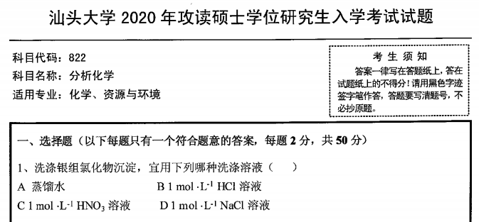 2020年汕头大学822分析化学考研真题(完整版)