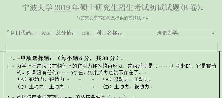 完整版请下载附件:2019年宁波大学933理论力学(B卷)考研真题(完整版)