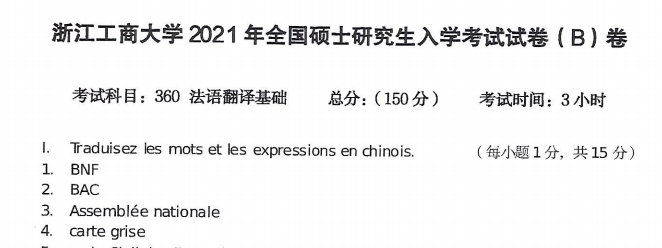 考研学习中,专业课占的分值较大。报考院校专业的考研专业课真题是专业课复习中必不可少的资料。聚创浙江工商大学考研小编为大家整理了2021年浙江工商大学360法语翻译基础考研真题(完整版),并且可以提供浙江工商大学考研专业课辅导,希望更多考生能够考上理想的院校。